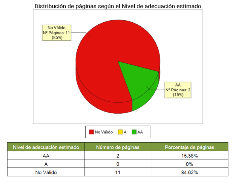 En el apartado de puntuación media y nivel de adecuación de cada página, se incluye la gráfica de cumplimiento por página y la puntuación obtenida, con su correspondiente tabla.